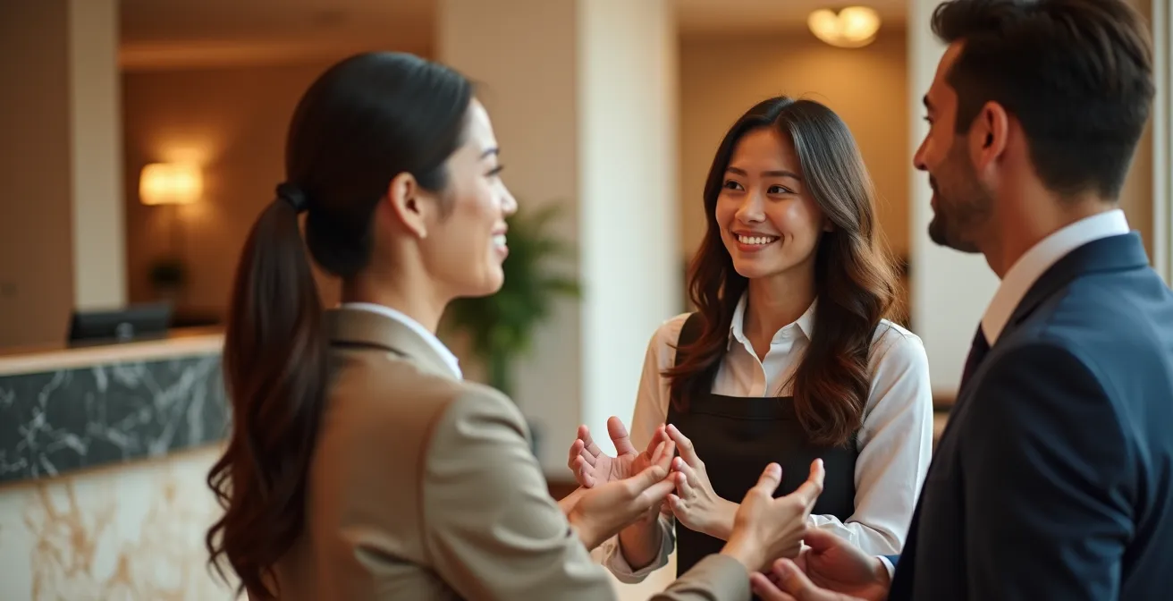 L’environnement joue un rôle clé dans cette orchestration. Un hall d’hôtel spacieux et bien agencé permet une communication non verbale subtile entre les membres du personnel, comme le suggère l’image ci-dessous. Le service devient alors une chorégraphie invisible où l’information circule sans que le client ne s’en aperçoive.