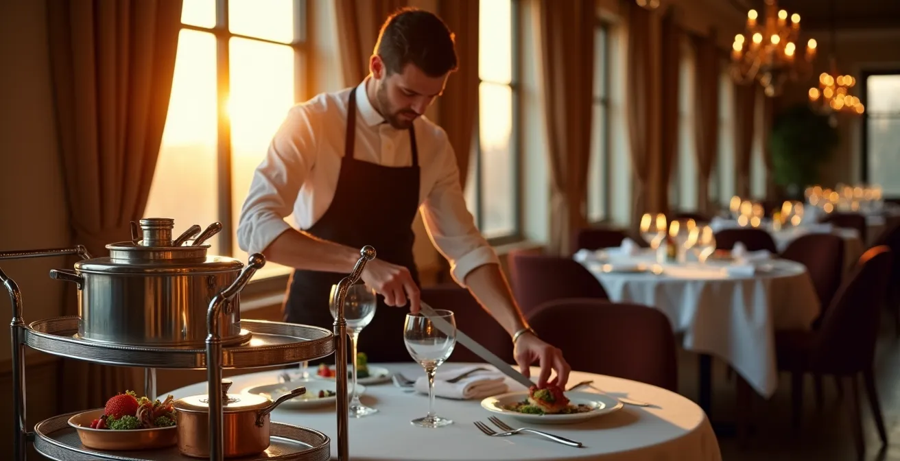 La découpe au guéridon est bien plus qu’une simple tâche de service, c’est un acte fondateur, un geste-signature qui transforme un plat en expérience. La crainte principale du professionnel est double : le tremblement dû au stress et l’accident qui souille la nappe, ruinant l’instant. La maîtrise ne vient pas de la force, mais d’une préparation méthodique et d’une compréhension de la mécanique du corps. Le secret réside dans la « chorégraphie de service » : chaque outil est à sa place, chaque mouvement est anticipé. C’est une séquence logique qui, une fois intégrée, devient une seconde nature.